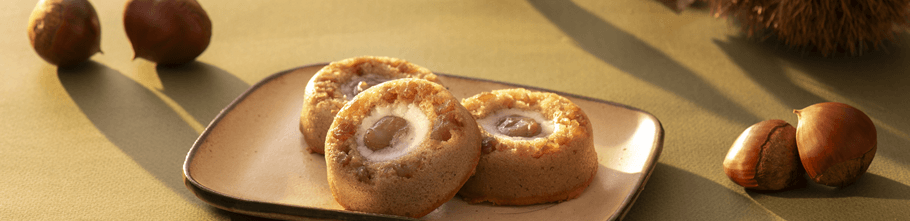 マロンの生地に、シロップ漬けした栗を散りばめて、栗のペーストをトッピングしました。マロンの甘みが豊かに広がる秋限定のお菓子です。