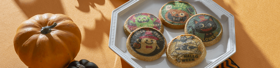 かぼちゃ風味のバタークッキーに楽しいお化けやジャックオーランタン達をプリントしました♪