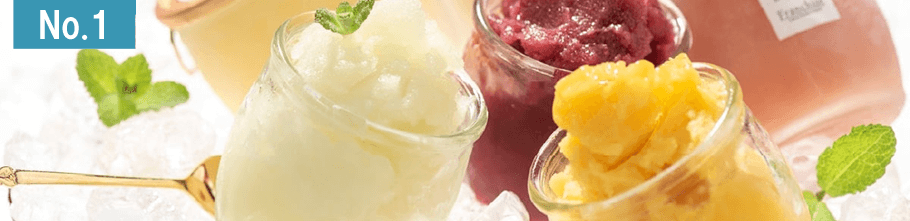 青りんご、マンゴー、いちご、甘夏みかん、白桃、カシス果実の風味をぎゅっと閉じ込めた、フルーティーな6種のソルベ・デ・ビジュー・デ・ビジュー。